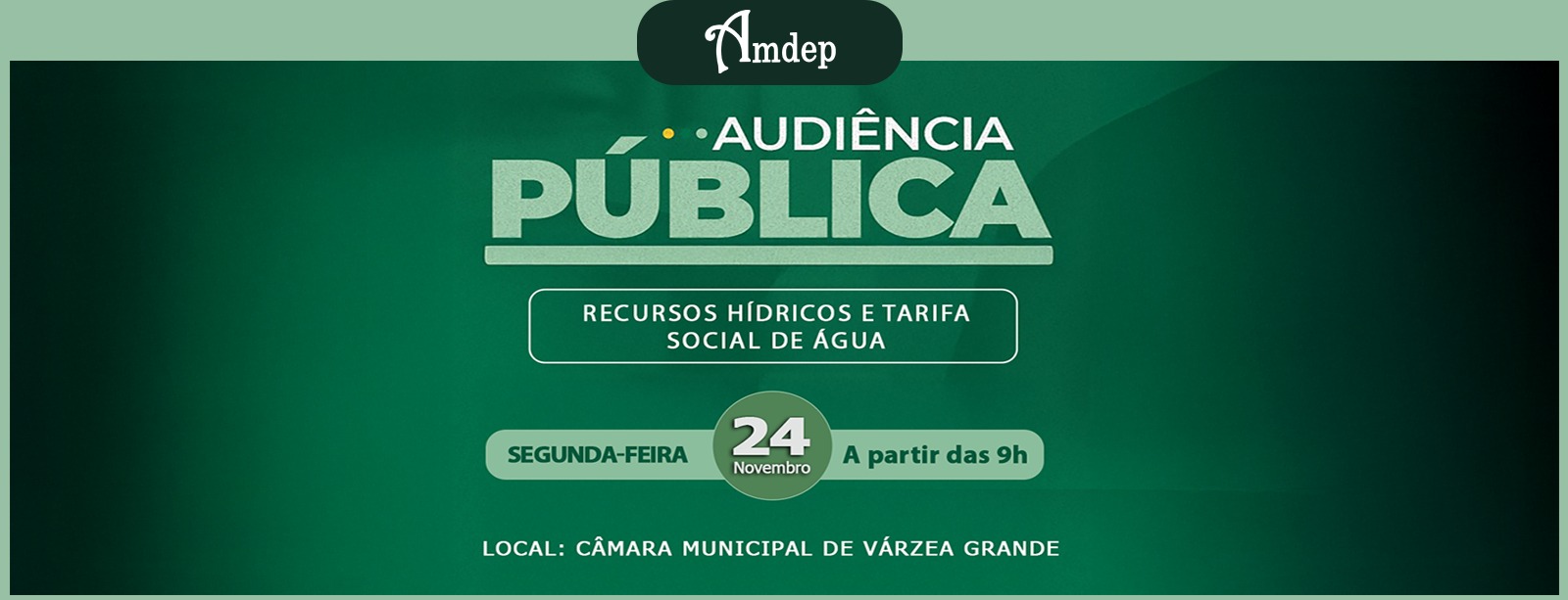 Com o compromisso de promover o debate público e estimular políticas voltadas à justiça social e ambiental, a Associação Mato-grossense das Defensoras e Defensores Públicos (AMDEP), em parceria com a Câmara Municipal de Várzea Grande, realizará, no dia 24 de novembro, às 9h, uma audiência pública sobre “Recursos Hídricos e Tarifa Social de Água”, no plenário do Legislativo Municipal.